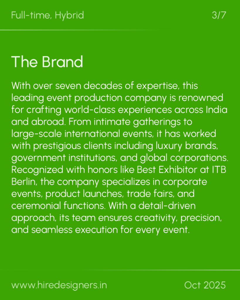 Bring a blend of creativity, technical expertise, and trend awareness to craft memorable experiences. Strong visual storytelling, proficiency in design tools, and vendor coordination are essential.