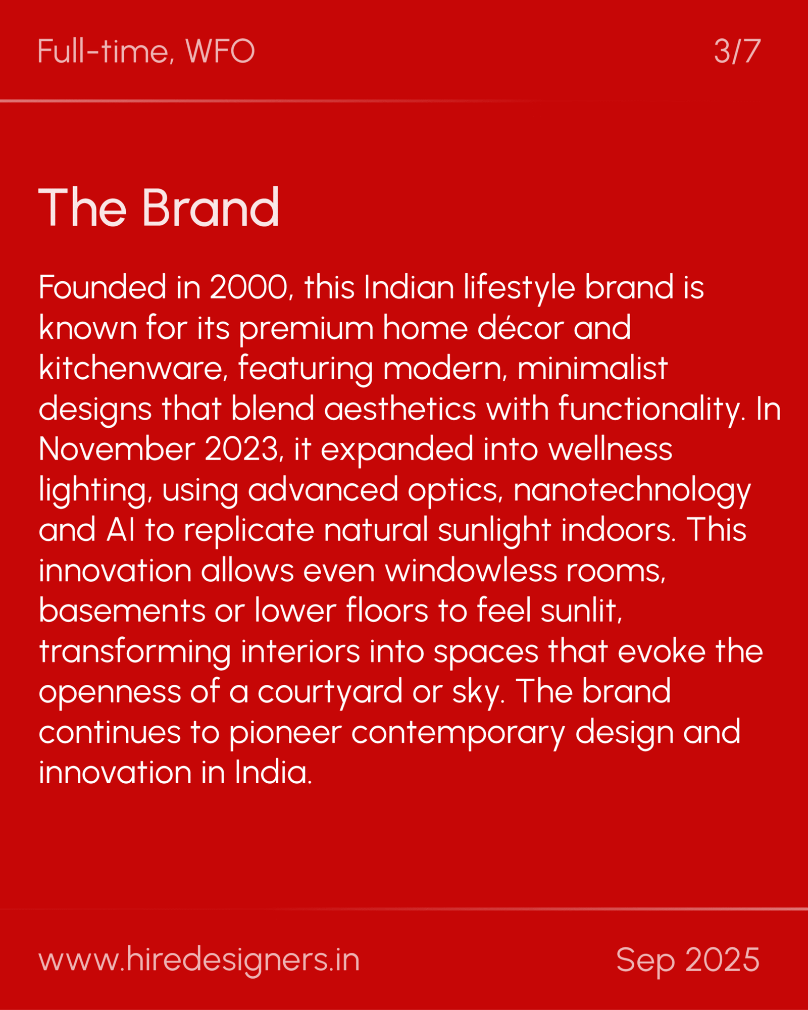 Founded in 2000, this Indian lifestyle brand is known for its premium home dรฉcor and kitchenware, featuring modern, minimalist designs that blend aesthetics with functionality. In November 2023, it expanded into wellness lighting, using advanced optics, nanotechnology and AI to replicate natural sunlight indoors. This innovation allows even windowless rooms, basements or lower floors to feel sunlit, transforming interiors into spaces that evoke the openness of a courtyard or sky. The brand continues to pioneer contemporary design and innovation in India.