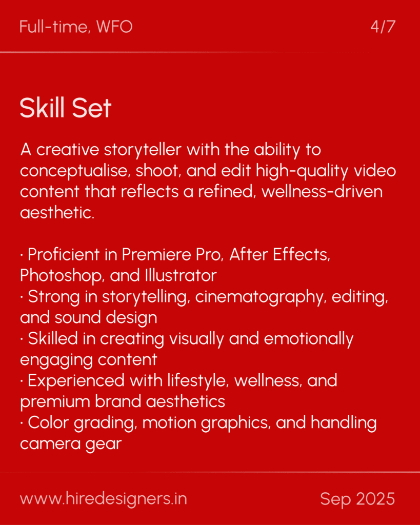 A creative storyteller with the ability to conceptualise, shoot, and edit high-quality video content that reflects a refined, wellness-driven aesthetic.