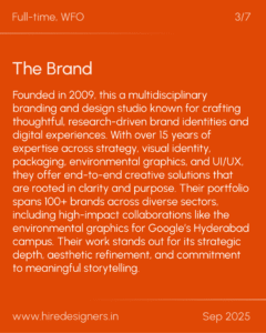 Founded in 2009, this a multidisciplinary branding and design studio known for crafting thoughtful, research-driven brand identities and digital experiences. With over 15 years of expertise across strategy, visual identity, packaging, environmental graphics, and UI/UX, they offer end-to-end creative solutions that are rooted in clarity and purpose. Their portfolio spans 100+ brands across diverse sectors, including high-impact collaborations like the environmental graphics for Googleโs Hyderabad campus. Their work stands out for its strategic depth, aesthetic refinement, and commitment to meaningful storytelling.