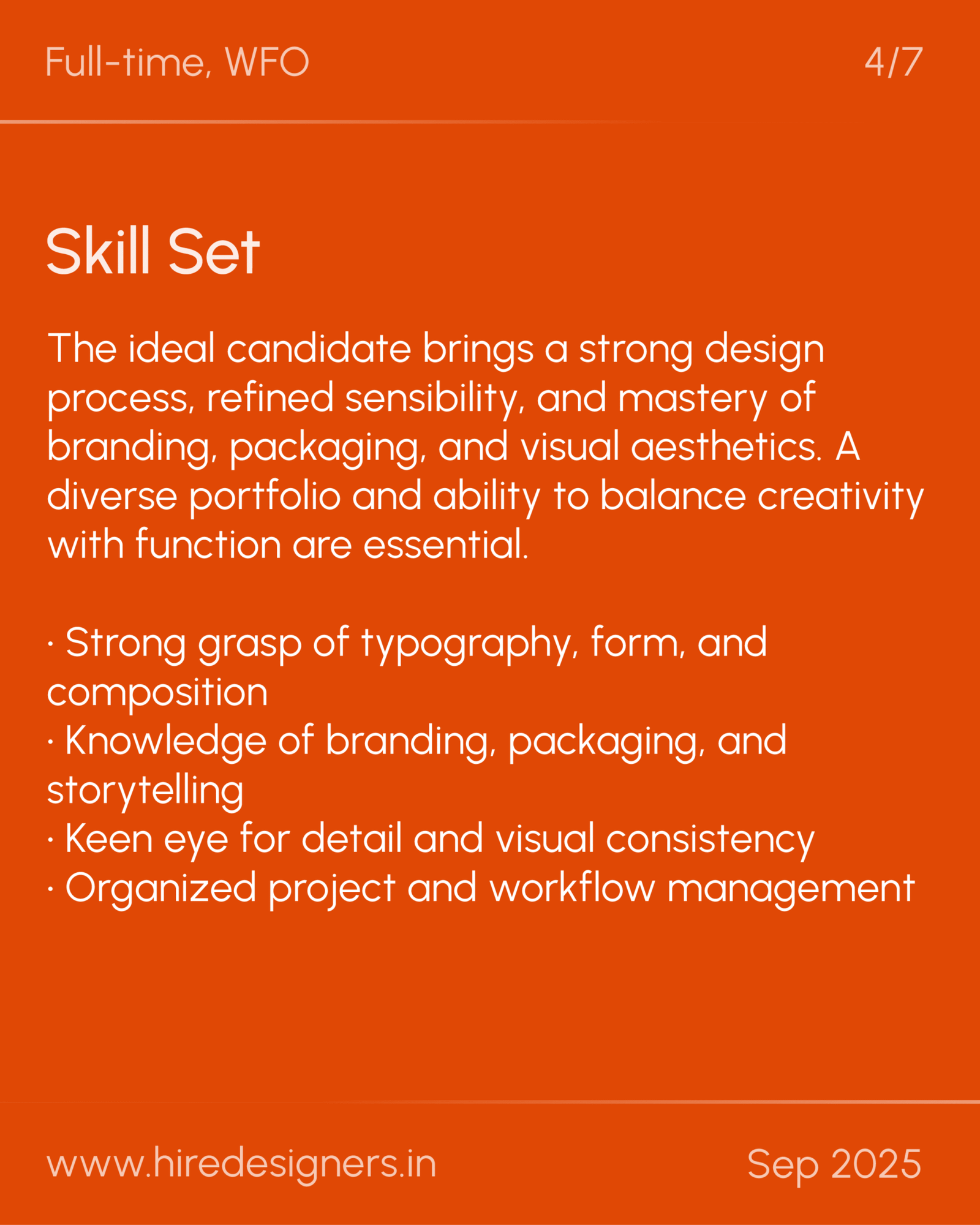The ideal candidate brings a strong design process, refined sensibility, and mastery of branding, packaging, and visual aesthetics. A diverse portfolio and ability to balance creativity with function are essential.