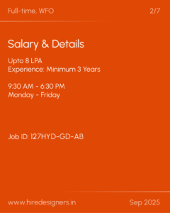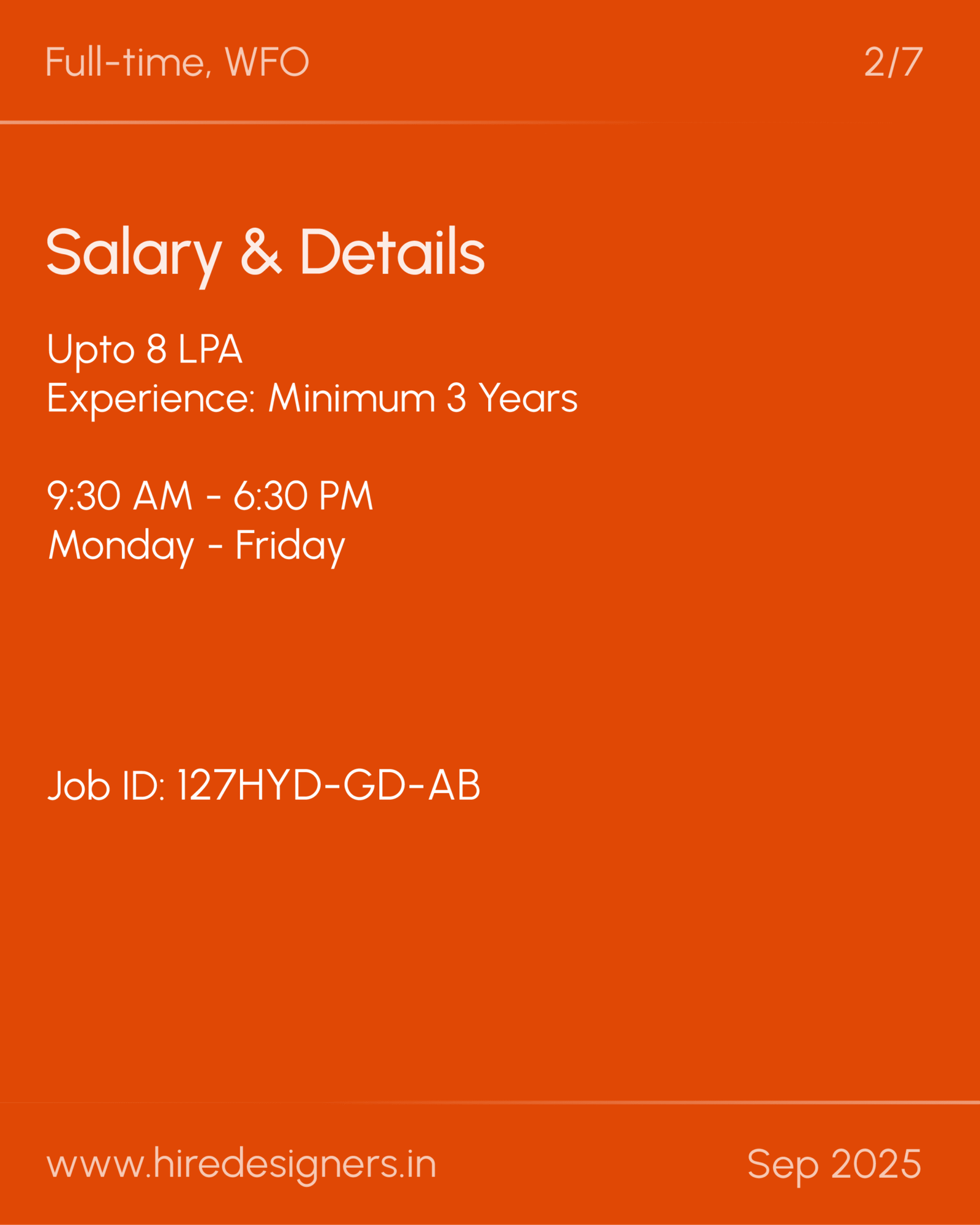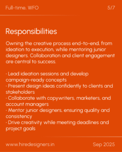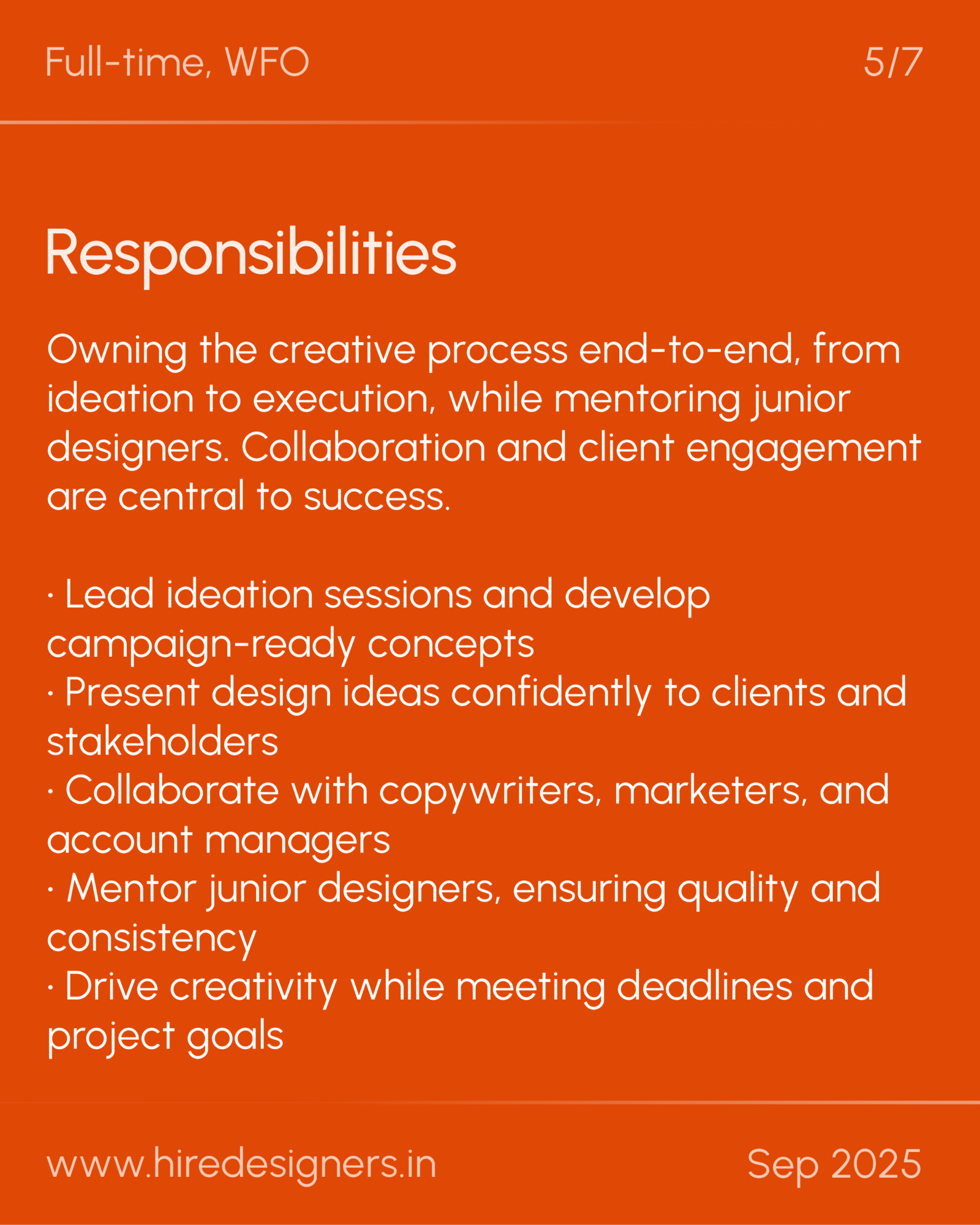 Owning the creative process end-to-end, from ideation to execution, while mentoring junior designers. Collaboration and client engagement are central to success.