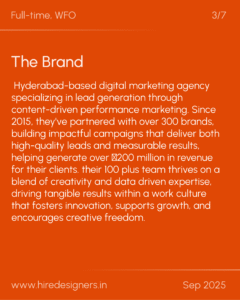 Hyderabad-based digital marketing agency specializing in lead generation through content-driven performance marketing. Since 2015, they’ve partnered with over 300 brands, building impactful campaigns that deliver both high-quality leads and measurable results, helping generate over โน200 million in revenue for their clients. their 100 plus team thrives on a blend of creativity and data driven expertise, driving tangible results within a work culture that fosters innovation, supports growth, and encourages creative freedom.