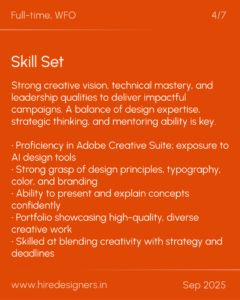 Strong creative vision, technical mastery, and leadership qualities to deliver impactful campaigns. A balance of design expertise, strategic thinking, and mentoring ability is key.