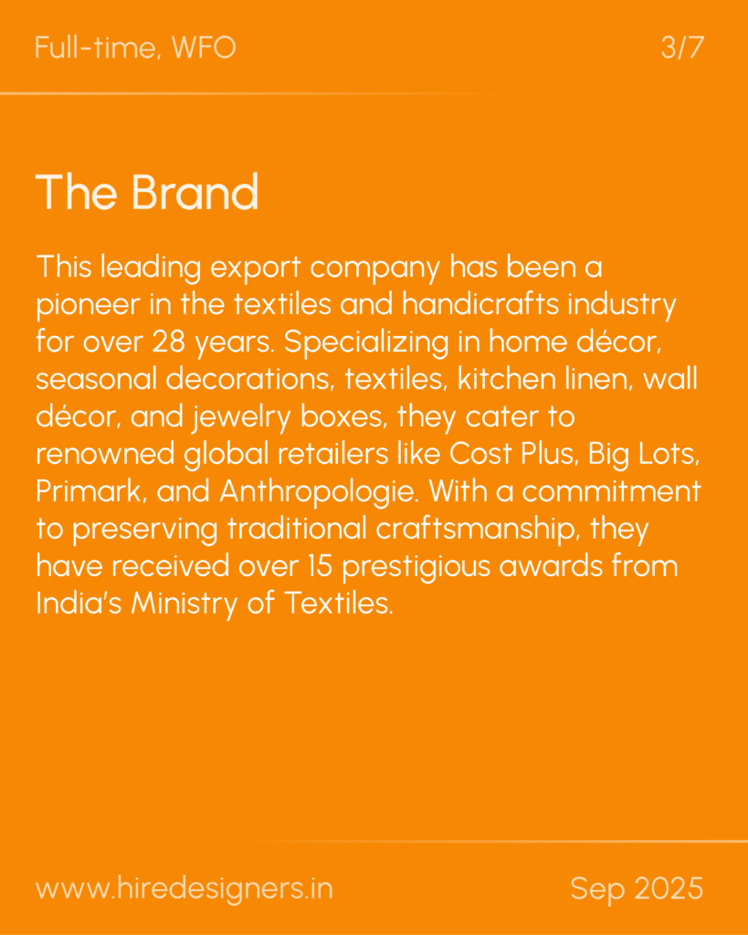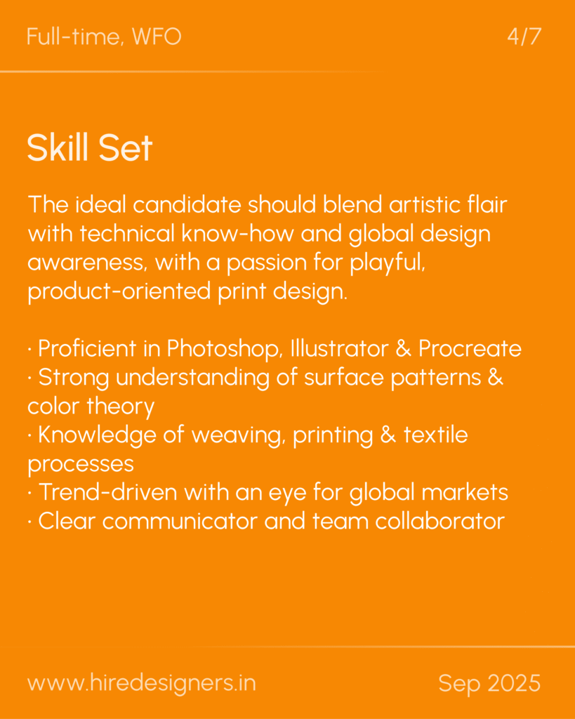 This role involves designing playful prints for a variety of products, including bags, pouches, home textiles, and apparel, with a focus on innovation and execution.