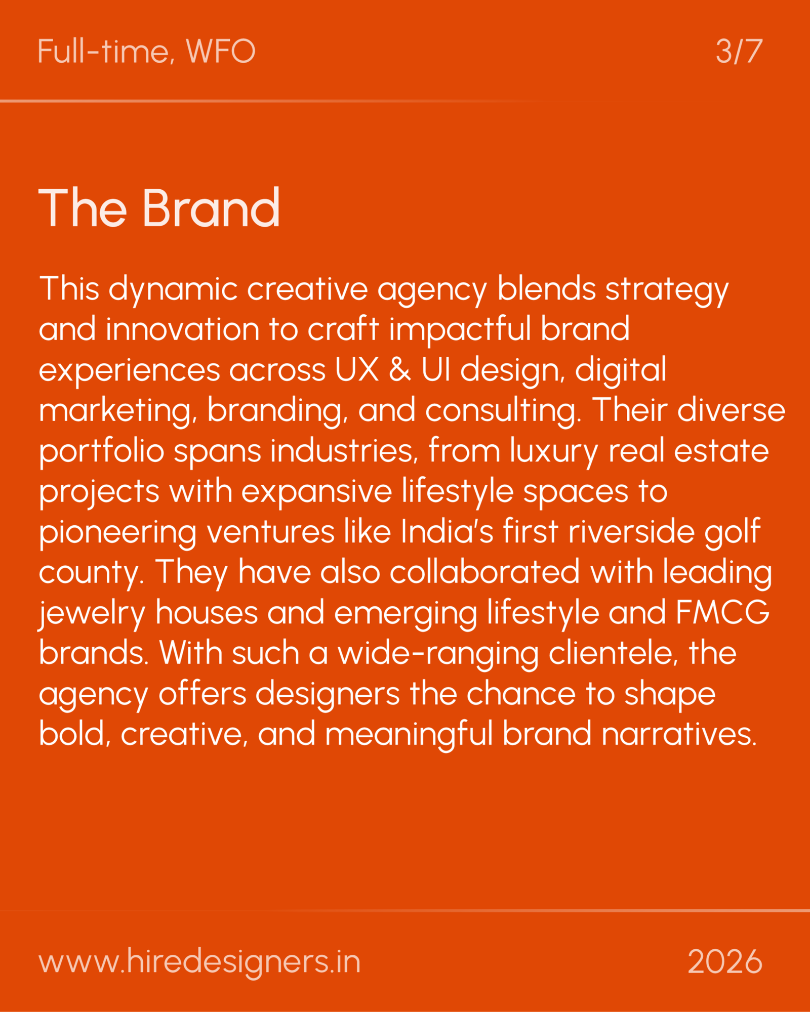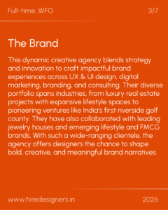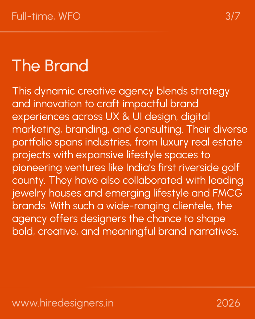 This dynamic creative agency blends strategy and innovation to craft impactful brand experiences across UX & UI design, digital marketing, branding, and consulting. Their diverse portfolio spans industries, from luxury real estate projects with expansive lifestyle spaces to pioneering ventures like India’s first riverside golf county. They have also collaborated with leading jewelry houses and emerging lifestyle and FMCG brands. With such a wide-ranging clientele, the agency offers designers the chance to shape bold, creative, and meaningful brand narratives.