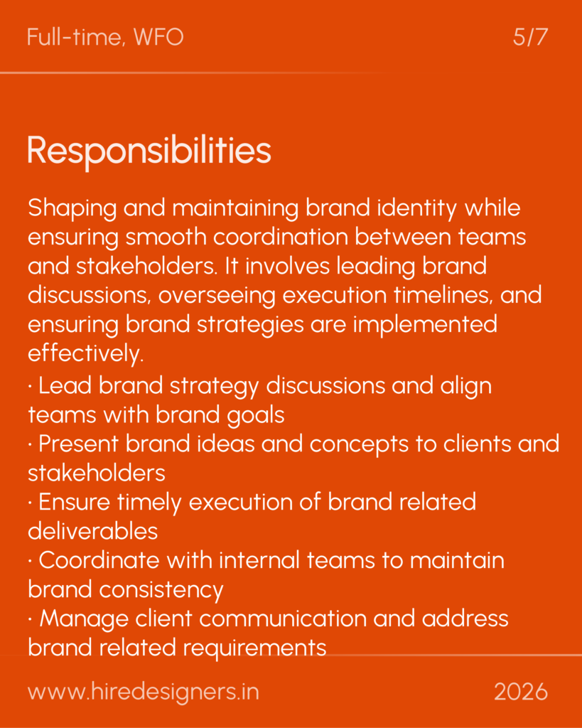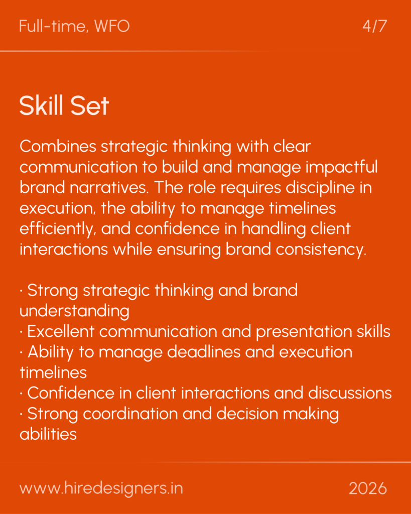 Combines strategic thinking with clear communication to build and manage impactful brand narratives. The role requires discipline in execution, the ability to manage timelines efficiently, and confidence in handling client interactions while ensuring brand consistency.