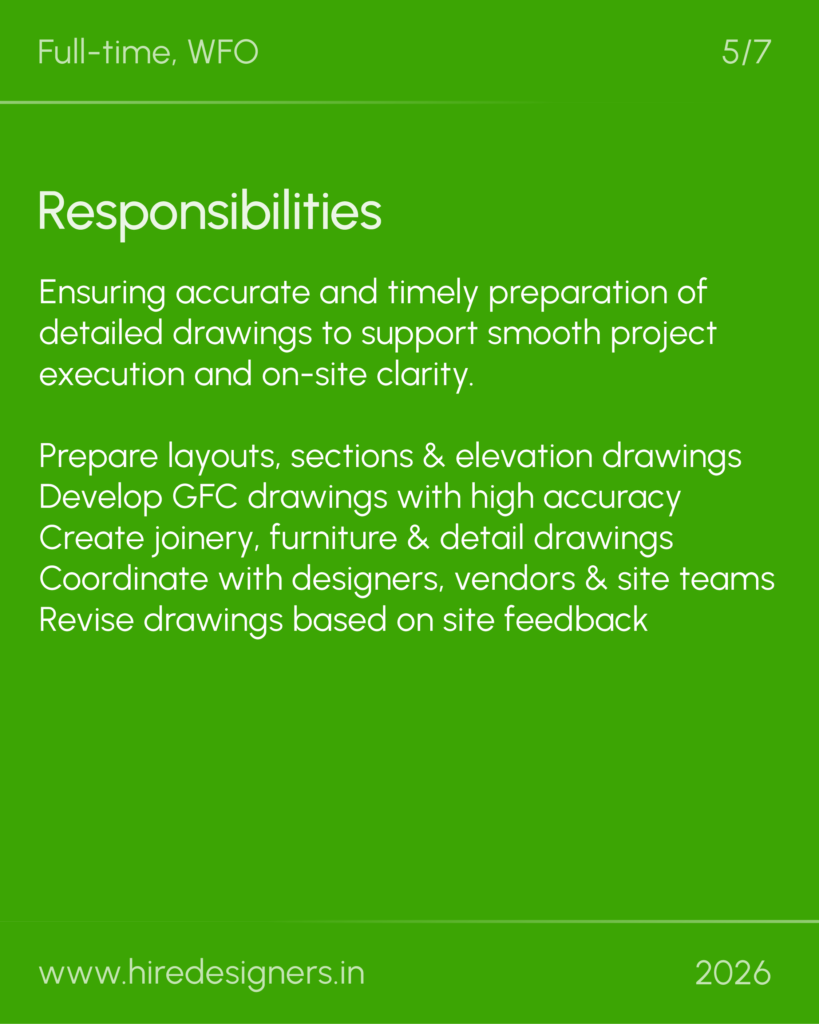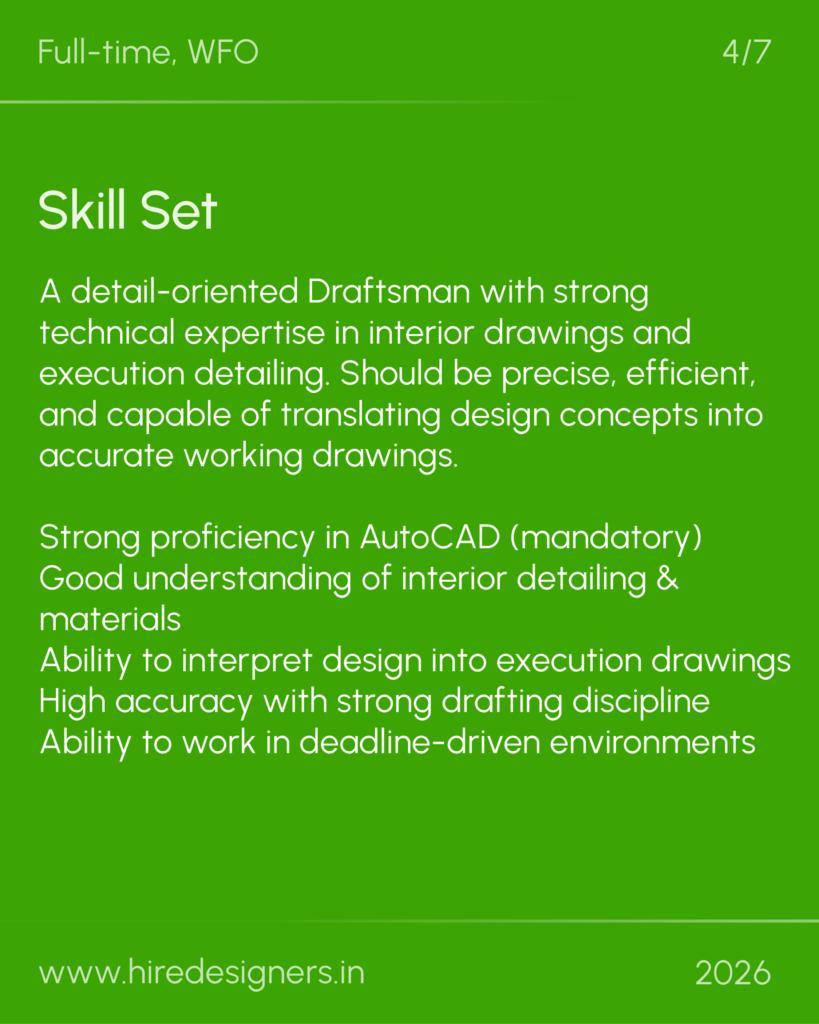 A detail-oriented Draftsman with strong technical expertise in interior drawings and execution detailing. Should be precise, efficient, and capable of translating design concepts into accurate working drawings.