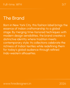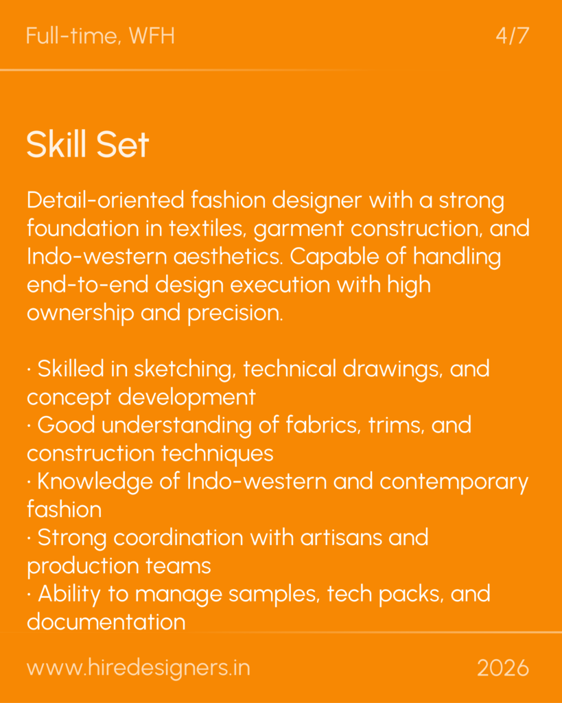 Detail-oriented fashion designer with a strong foundation in textiles, garment construction, and Indo-western aesthetics. Capable of handling end-to-end design execution with high ownership and precision.