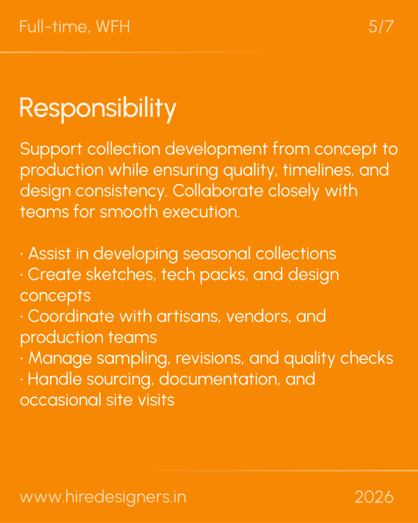 Support collection development from concept to production while ensuring quality, timelines, and design consistency. Collaborate closely with teams for smooth execution.