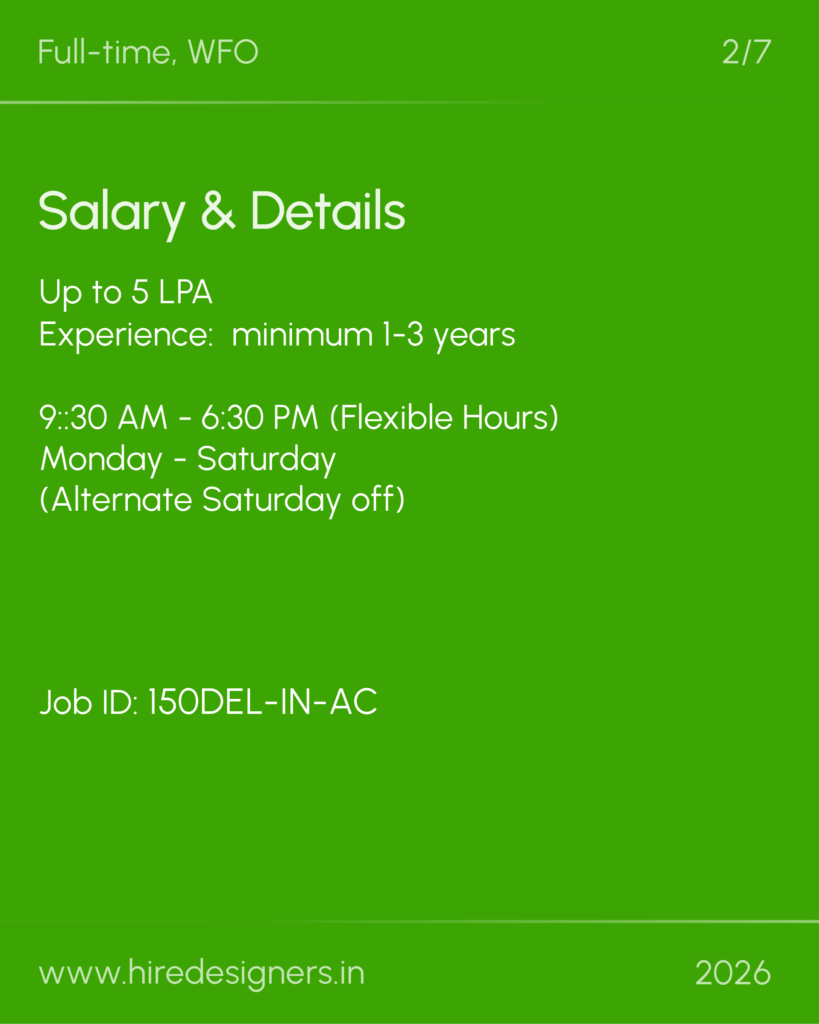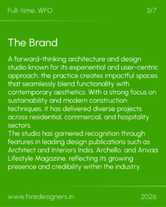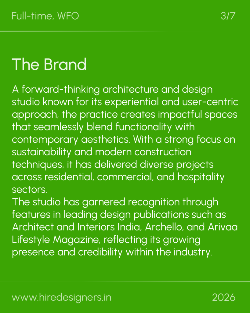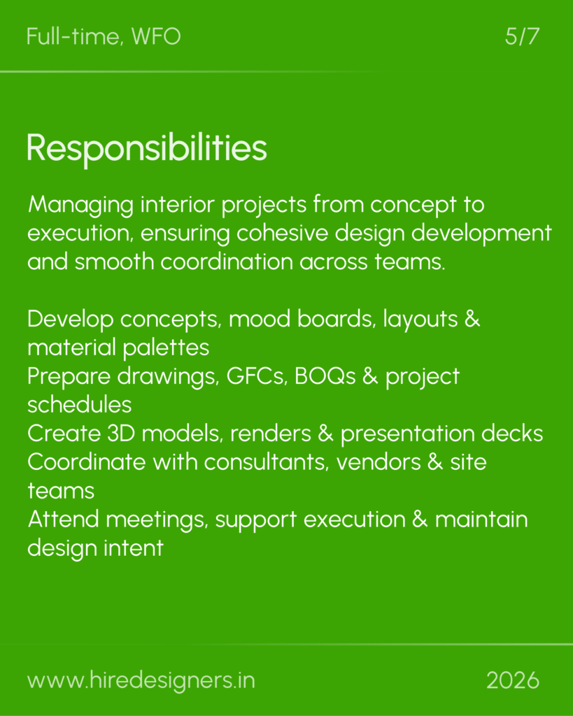 A creative Interior Designer with a strong eye for detail, materials, and spatial storytelling. Should be capable of handling projects end-to-end while ensuring design intent and execution quality.