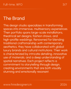 This design studio specializes in transforming spaces into immersive, multisensory experiences. Their portfolio spans large-scale installations, theatrical set designs, fashion shows, and high-profile weddings. Renowned for blending traditional craftsmanship with contemporary aesthetics, they have collaborated with global luxury brands and cultural institutions. Their work is characterized by intricate detailing, innovative use of materials, and a deep understanding of spatial narratives. Each project reflects a commitment to storytelling through design, creating environments that are both visually stunning and emotionally resonant.